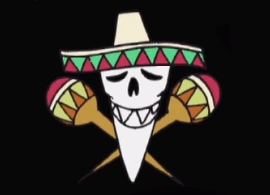 The Amigo Pirates' Jolly Roger is a more narrowed white skull wearing a white sombrero with green and red triangle decorations. Behind the skull are two light brown maracas with a red tip at the end of each one.[1]