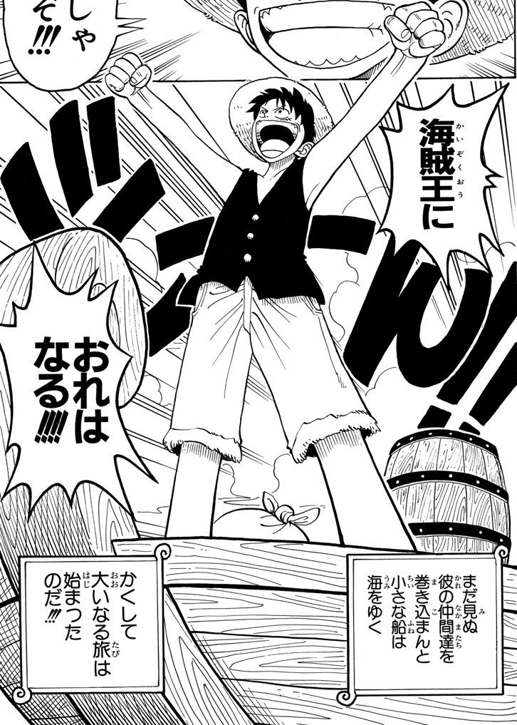 For Oda, constructing the first chapters of One Piece was relatively straightforward. Knowing Jump customarily gave any new serial around ten installments to gauge reader response, he (with Asada's help) refined the earlier portions of his concept material into eight chapters: seven for a largely self-contained "introduction" arc, and one beginning a second, more elaborate arc.