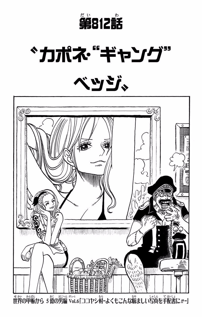 Nojiko watches Genzo complain about the decency of Nami 's new wanted poster photo, even though he has placed an enlarged print of the photo in his office yet again. (Chapter 812 )