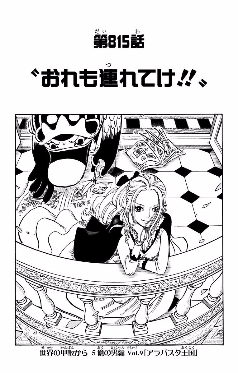 Vivi thinks fondly about her friends while on the balcony of Alubarna Palace as Karoo carefully clips out the pictures of the Straw Hats from the newspaper. (Chapter 815 )