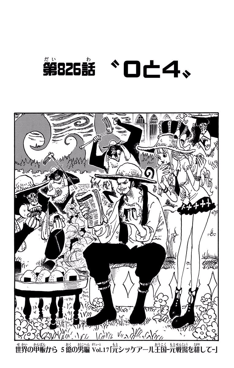 Dracule Mihawk and Perona read the news of the Straw Hats' new bounties. The Humandrills are shown to have farming skills. (Chapter 826 )