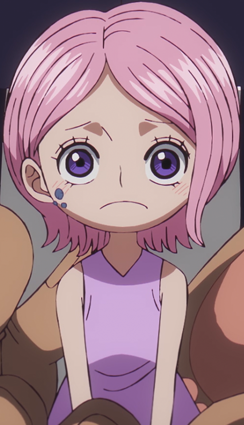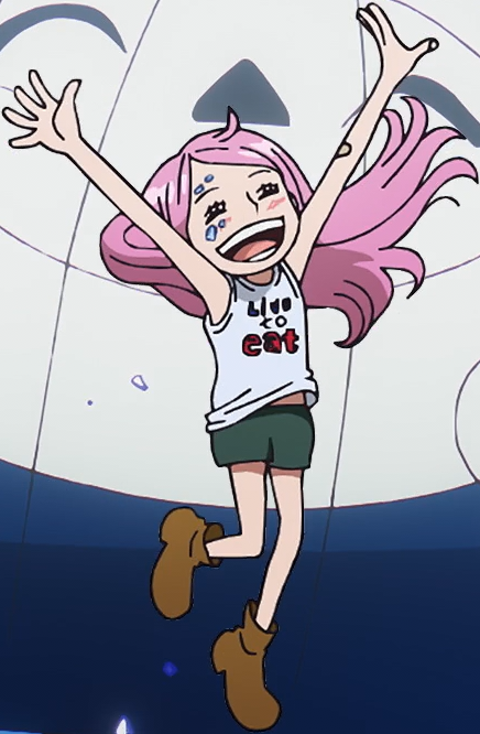 Bonney has always displayed an aggressive temper and rude attitude, seemingly stemming from her early childhood as a frequent victim of bullying due to her rare medical condition, which prevented her from socializing with other children normally. Still, even at the young age of five, Bonney knew how to be tactful and show restraint, mostly to prevent upsetting her father, Kuma. Said mindset extends to this day, as she knows when to fight and when to prevent trouble, particularly in dangerous territories such as the Sabaody Archipelago. When she saw Zoro attempting to attack a World Noble, she orchestrated a scene to fake Zoro's death and prevent an escalation, knowing full well that such a thing would have led to terrible consequences.[15] However, this sense of caution is overwritten when enticing food is involved, similar to Luffy and Chopper.