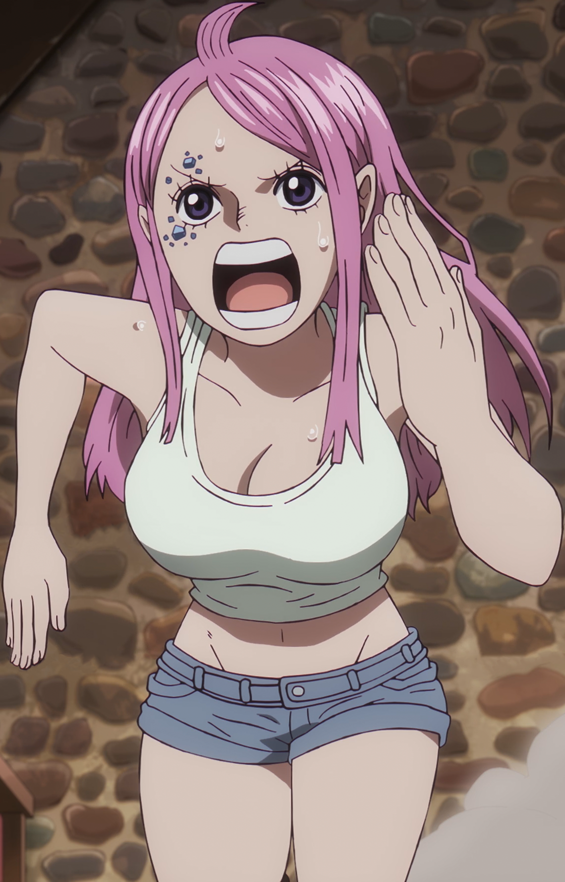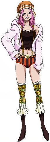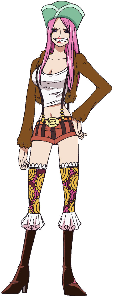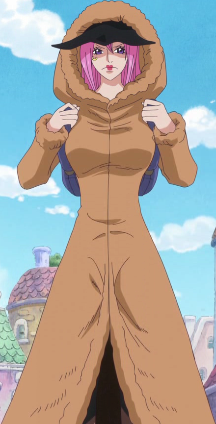 Her outfit consists of a white low-cut tank top, along with a pair of orange-and-black striped buckled shorts with long, thin suspenders. She also wears black high-heeled boots that reach to her calves, with large laces coming from the openings, and a pair of hot pink and dark red stockings with a yellow sun-like motif on them (a pattern seen other times in the One Piece world). She has a golden anti-eyebrow below her right eye where her Sapphire Scales used to be, which she adorned hoping it would help her father recognize her. She also wears bright red lipstick on the middle of her lips due to not knowing how to apply lipstick properly. She consistently wears a brown furred jacket and a green Furażerka hat with a light-green lining that has foldable earflaps that can be pulled down for disguise and cold weather; she received both of these items from Conney when she escaped from government custody.
