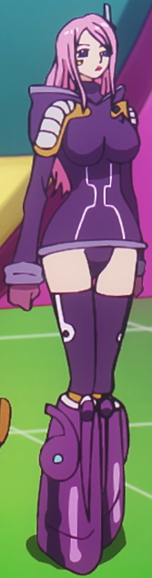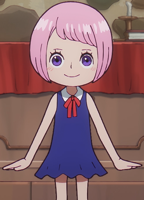 During the Egghead Arc, Bonney wears no hat. Through the use of a clothes-changing machine at Egghead, Bonney started wearing a purple leotard bodysuit with a hood, along with purple gloves, thigh-length purple leggings, an earpiece, and a pair of purple DOM shoes. After escaping from Egghead and during the Elbaph Arc, Bonney has remained in her child form.