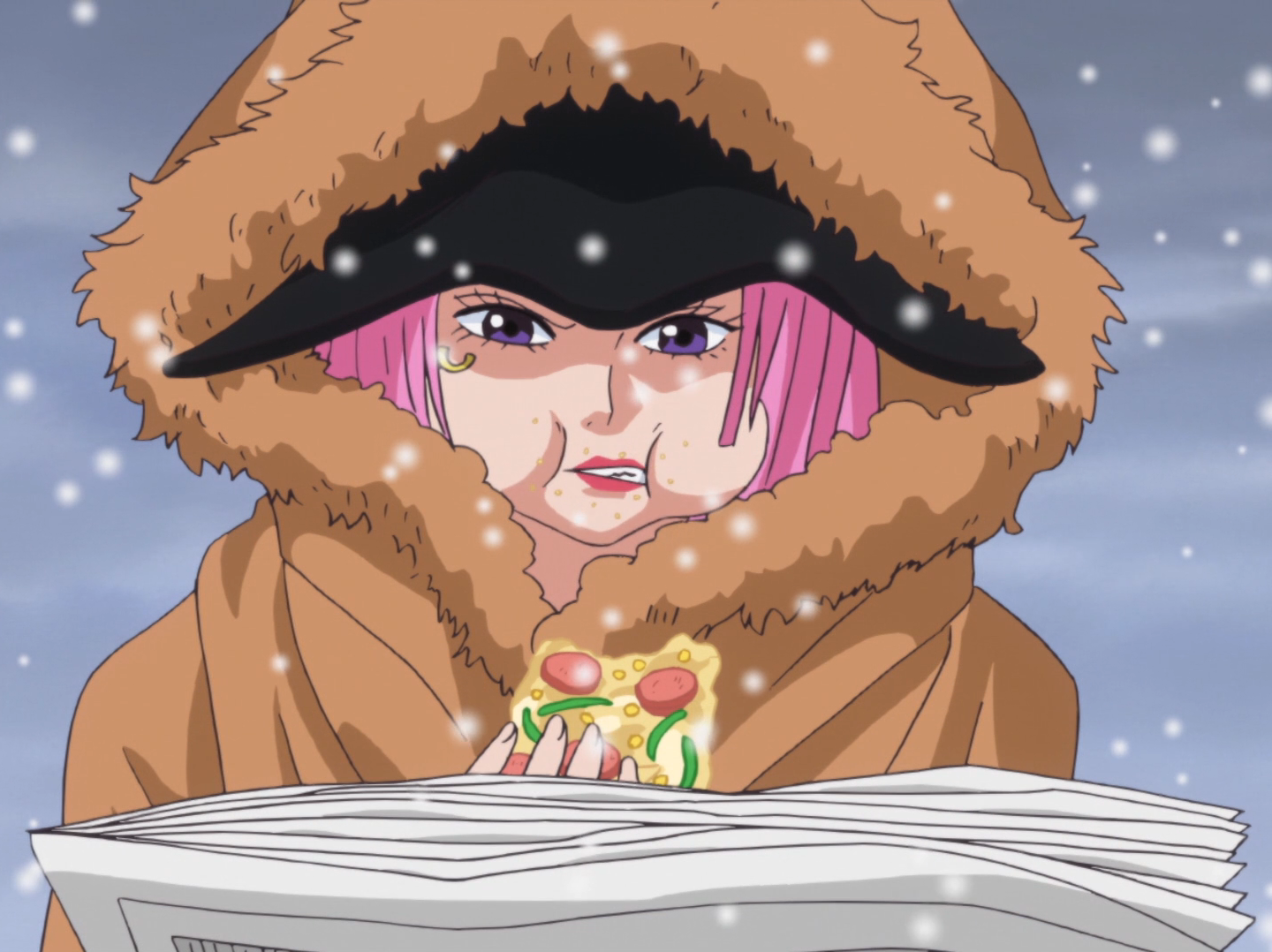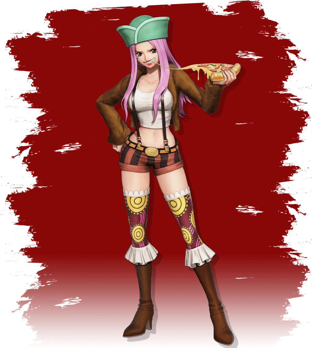 Befitting her epithet, Bonney is an extremely gluttonous person with very poor table manners. She will, for instance, demand more food before finishing her current meal, eschewing utensils and talking with her mouth full. She is usually seen eating pizza, her favorite food, even when fighting or on the run.[18][1][19][20] She shares this quirk with her late mother, Ginny, who was similarly insatiable when it came to eating, and it is a big reason for her rapport with Luffy.