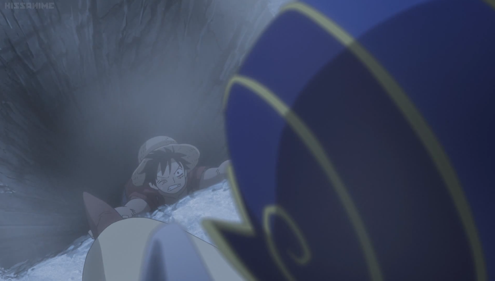 Luffy brought himself to the place where his crewmates were tied up, but fell into a pitfall. Komei arrived and told the hanging pirate that seawater was below, and explained to Luffy his hatred of pirates. Komei then used Armament Haki to turn his fan into a long sword, which he used to drive Luffy into the seawater below. Nami arrived to save Luffy, driving Komei away with an explosion. However, Komei returned and prepared to attack Nami in the hole, but was stopped by Foxy and Kansho. Komei was held at gunpoint as Nami brought Luffy up and resuscitated him. As Luffy went to free his crewmates, however, Kansho shot him.