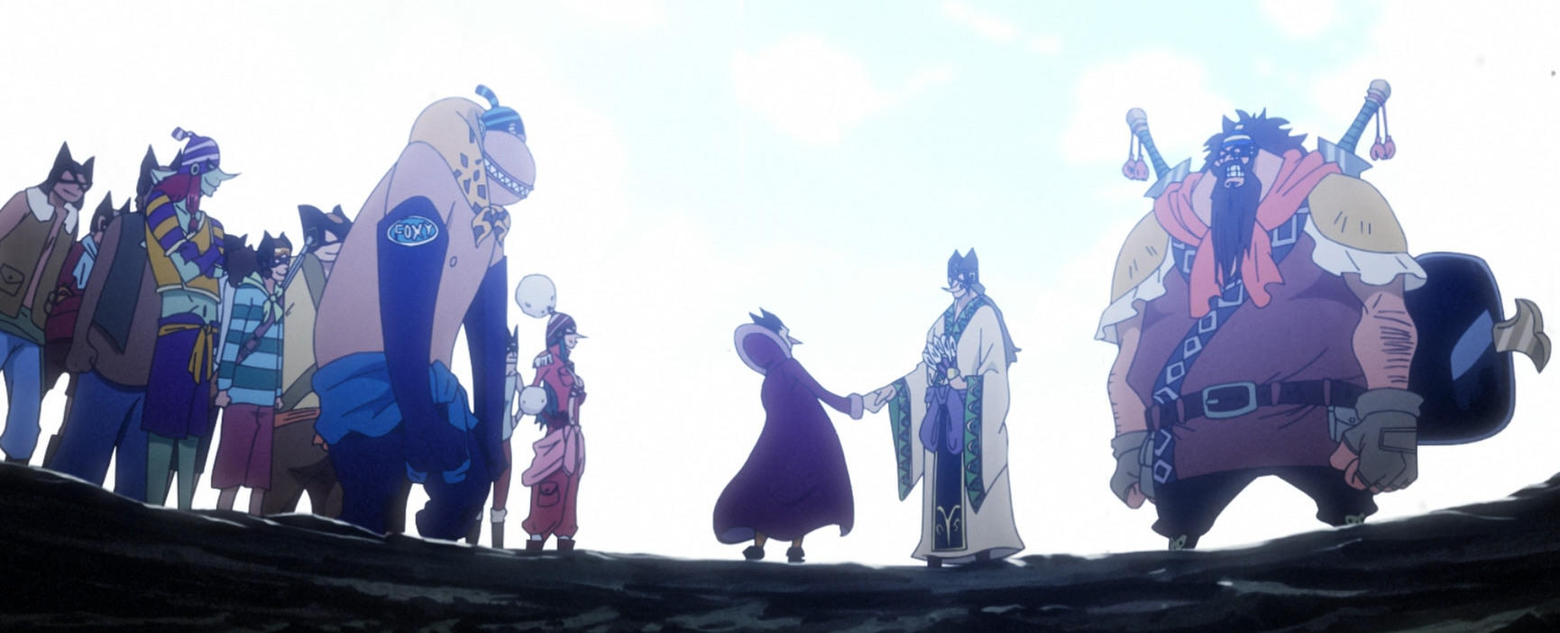 Komei revealed that Kansho was working for him the whole time, but stayed behind so he could betray Foxy and Luffy at the right time. Nami attacked Komei with Thunder Lance Tempo, but Komei redirected it back to her and Foxy, electrocuting them. Komei had his soldiers handcuff the two as dawn broke and he stood victorious over the Straw Hats. Komei made preparations to take the pirates to Marine Headquarters, and ordered Dojaku to activate his invention. However, it was cut short as the volcano erupted and out emerged Kinoconda, a snake from Kinoko Island carrying the other Straw Hats and Foxy Pirates.