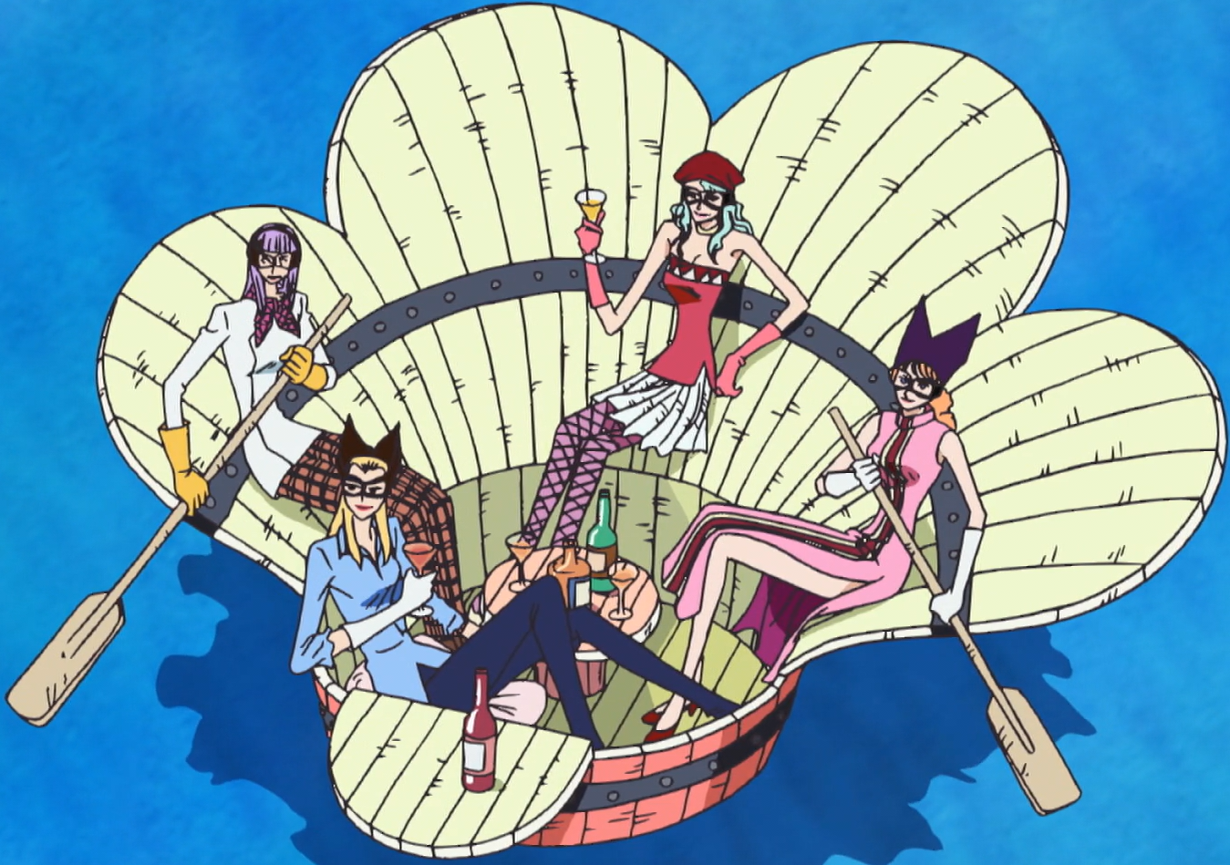 The Cutie Wagon is a small vessel resembling a giant pink seashell. It was used by Porche's team during the Donut Race against the Straw Hat Pirates. It was pulled by the star shark Monda and further supported by the Fish-Man Capote, allowing the watercraft to attain high speeds.
