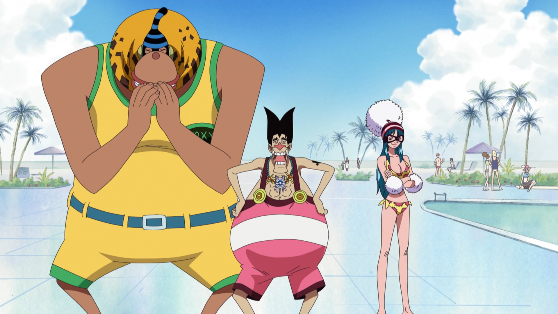 With Komei's guidance, the crew developed a plan to lure the Straw Hats to Kinoko Island by disguising the crew as women in distress to trick Sanji into convincing his crew to help them. Upon landing, Foxy challenges the Straw Hats to a Davy Back Fight. Using tactics devised by Komei, they used underhanded techniques to disable the crew. However, unbeknownst to Foxy, Porsche and Hamburg would get drawn into Komei's ultimate scheme to capture the Straw Hats.