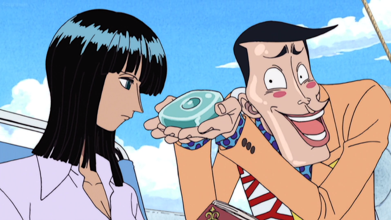 Nami asked if he sold paper strong enough to resist weathering. Rice Rice revealed his Millenium Paper, explaining its qualities and possible uses. When Luffy asked if it could be used to make paper airplanes, Rice Rice annoyedly said that doing so would be a waste. Recognizing Nami’s strong desire for the paper, he tried to cheat her and drive up the paper’s price. He offered it to her for a “reduced rate” of