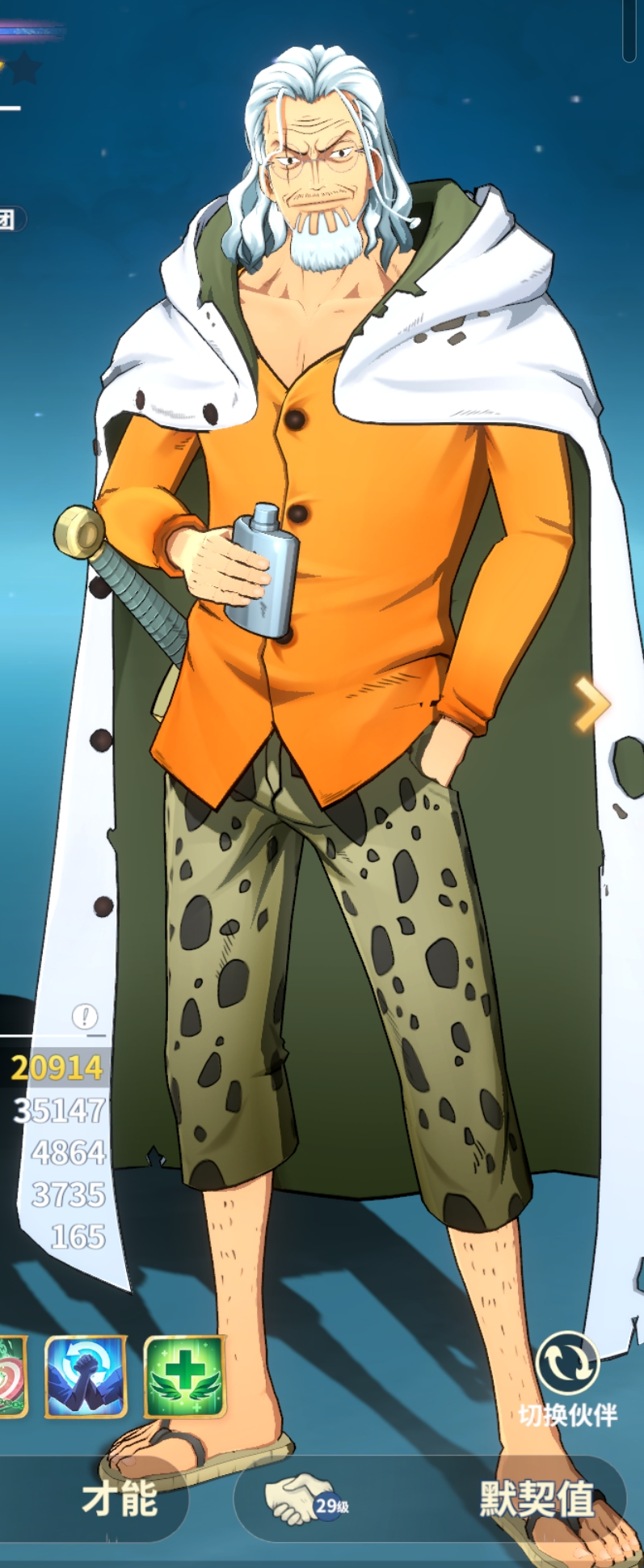 Light-hearted, casual, fun-loving, and righteous, Rayleigh's attributes bear a striking resemblance to his former captain, Roger in the present day. When he served as first-mate, however, he was shown to have been more impatient, rational, and serious when compared to most other hands and sailors, easily irritated with the antics of the younger crew, and being more of a disciplinarian. His more serious demeanour also gave him some advantages, being the only one among his compatriots not to fall for Shakky's beauty and charm. However, he has mellowed since his crew disbanded, becoming much more relaxed even when training Luffy. While often casual, with a hint of seriousness and extreme strength hiding behind his glasses, Rayleigh enjoys going with the flow and appearing in unexpected places and in unexpected ways, especially given his status and age.