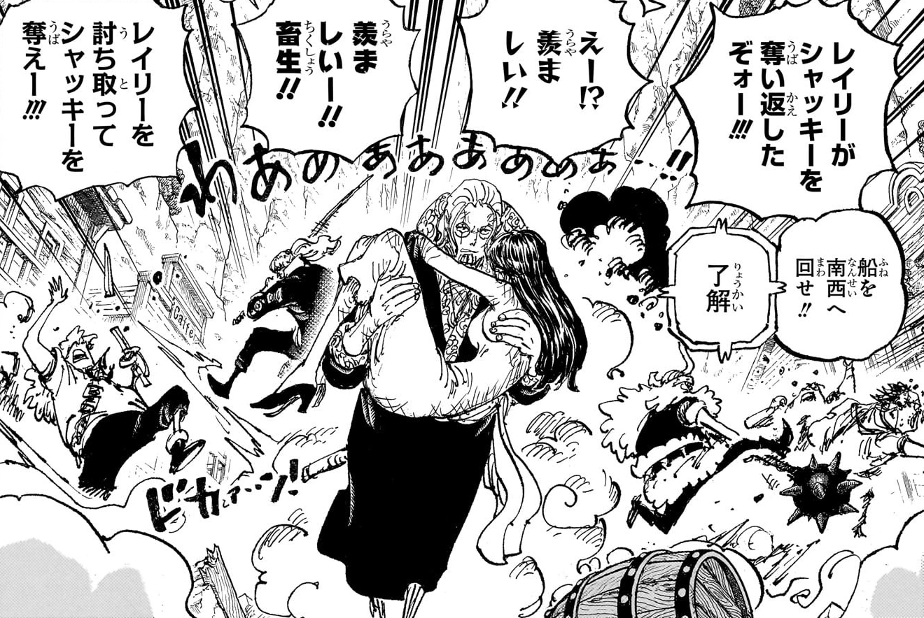 40 years ago, when the crew went to Shakky's Rip-off Bar, Rayleigh chose to remain on the ship while the rest of the crew went to visit her. The following year after learning Shakuyaku was kidnapped, Rayleigh was notably distressed, but when he and the rest of the crew learned that she was captured as a slave on God Valley, Rayleigh and the rest of the crew passionately set out to rescue her. Upon rescuing her from Shepherd Sommers, Rayleigh embraced Shakuyaku and broke into tears, relieved that she was safe.
