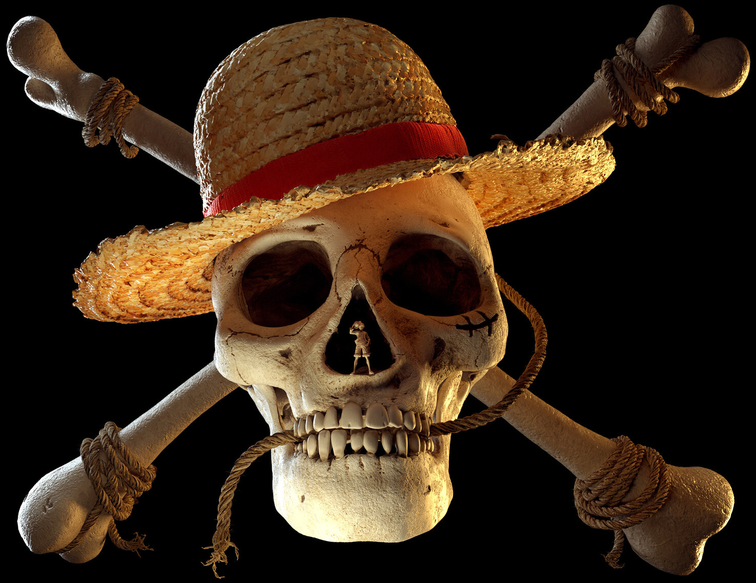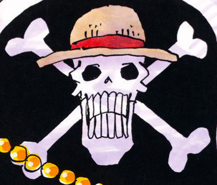 The Jolly Roger emblem is a cartoon-like depiction of traditional skull and crossbones, with the skull wearing Luffy's trademark straw hat. Due to Luffy's morbid drawing skills, Usopp was the one who drew the flag. In addition to being on their flag, the Jolly Roger has also been shown on the sails of the Going Merry and the Thousand Sunny.