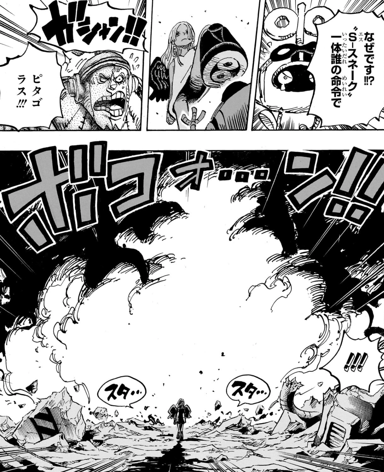 After CP0 had been subdued, Pythagoras went to look for the missing Vegapunk Stella on Shaka's orders. While he was searching for the Stella, Pythagoras was approached from behind by S-Snake, and an explosion went off in the laboratory,[9] which he survived by detaching his head from his body. He then met up with Usopp, Franky, Lilith, and York, who went there to investigate the explosion. Usopp aimed at him, so Pythagoras explained to them that he is his head. Before he can say that S-Snake is an enemy, he witnesses her turn York into stone. S-Snake then fires a beam at them, throwing them off the platform. Lilith held Pythagoras and used her DOM shoes to land safely. Pythagoras panicked when Lilith was unable to contact Shaka.[10]