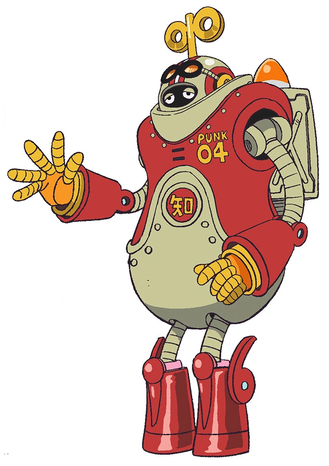 Pythagoras is a large mechanical being. His head was a sphere with a turn-key protruding from the top and a space in the front containing his eyes which always appeared drowsy; his head could detach from the main body and move independently with a set of retractable arms and legs. Pythagoras' main body was metallic, with the top part being red and the bottom cream. His designation, Punk-04, was printed on his left breast and the kanji for "wisdom" (知?) was printed on the center of its chest. His arms, hands, and legs were composed of bendable metal rods.[1]